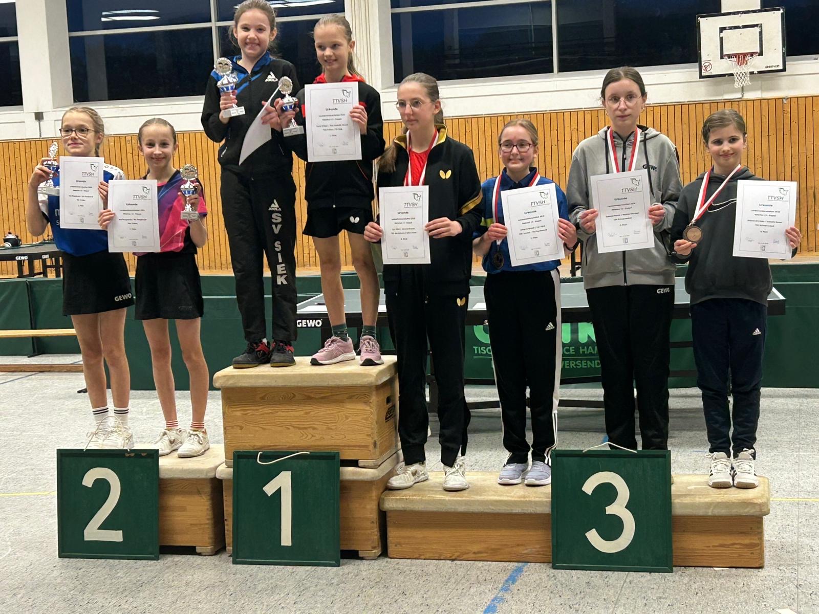 Bei den Landesmeisterschaften der Mädchen 13 holten Nea Maurer und Anna Krüger vom TSV Trittau überraschend Gold. Die Beiden, die am Vortag Platz 2 in der 11er-Konkurrenz zusammen holen konnten, besiegten hintereinander die Kombinationen Truhn und Zock, Johannson und Wulf, Plötzl und Brandt sowie im Finale die Trittauerinnen Borgwardt und Pflughaupt mit 3:0.