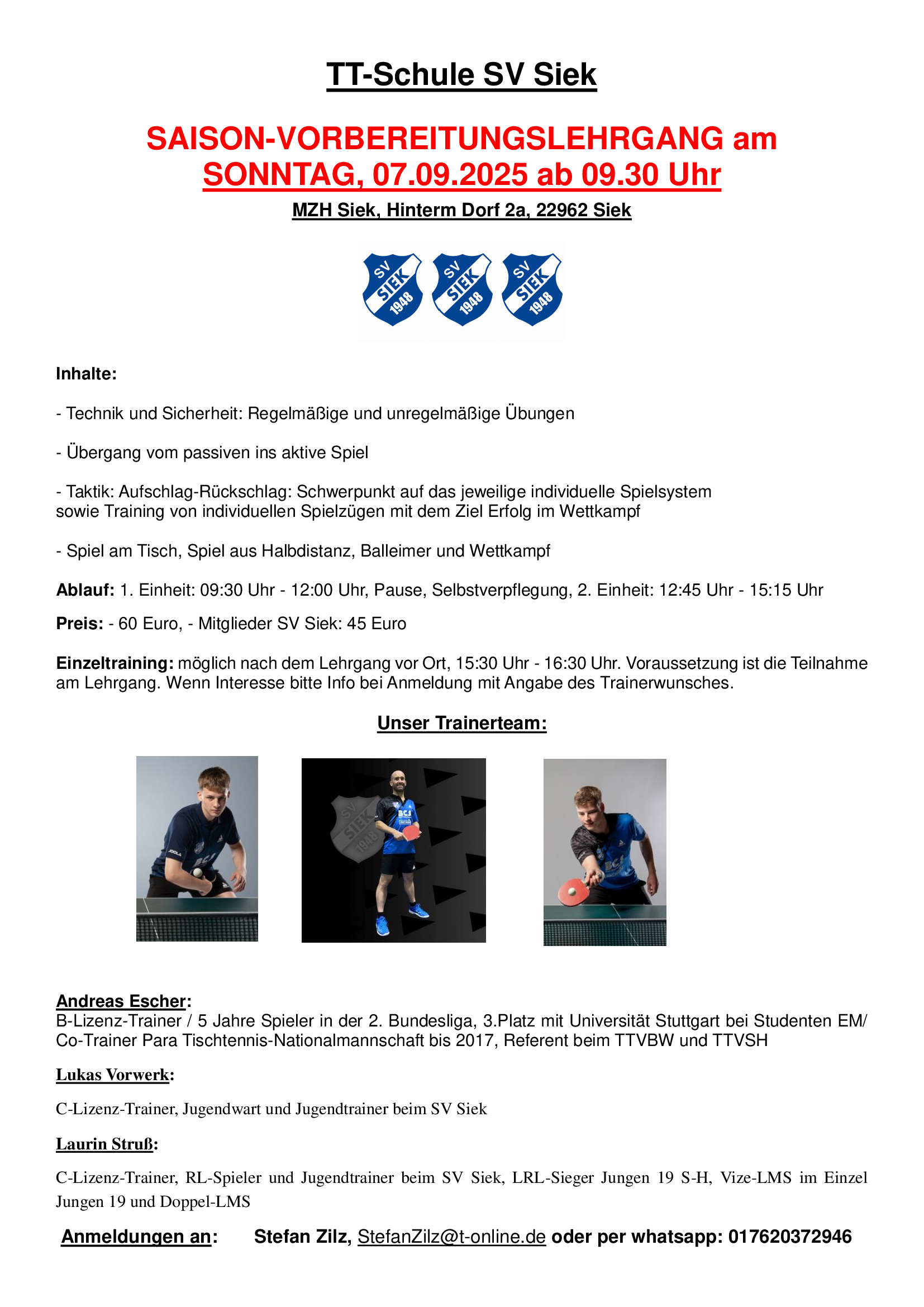 Und noch der Hinweis dass für den Saisonvorbereitungslehrgang am Sonntag, 07.09. in Siek mit unseren lizensierten Trainern noch einige Plätze frei wären...wir freuen uns wieder auf Eure Anmeldungen...