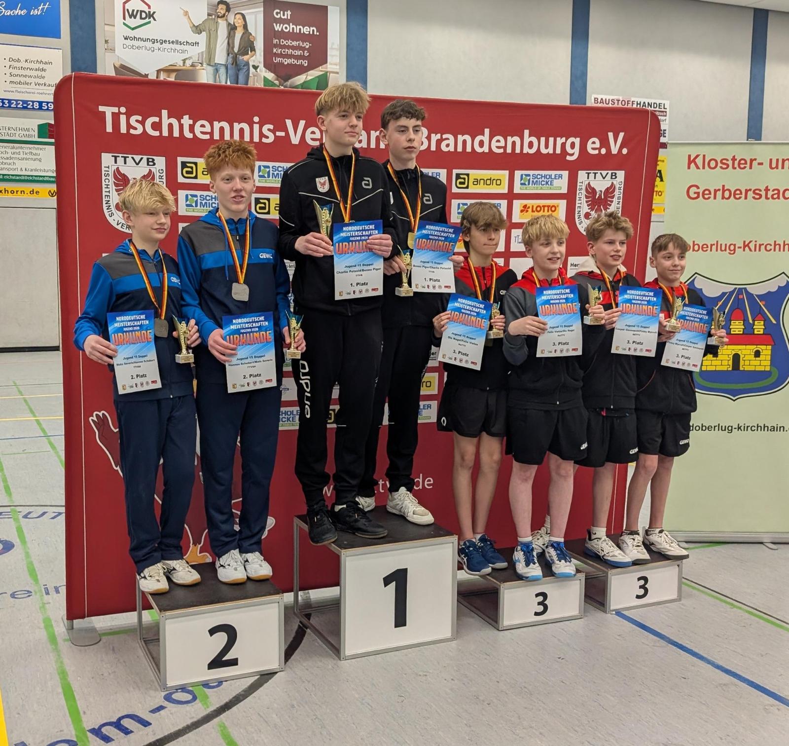 Hannes Schubert holte am Wochenende in Kirchhain in Brandenburg bei den norddeutschen Meisterschaften der Jugend 15 Bronze im Einzel und Silber im Doppel. Nach seinen zwei Erfolgen in der Gruppe hatte der trainingsfleißige Youngster als Gruppensieger im Achtelfinale ein Freilos und im Viertelfinale bezwang er Lars Hermes aus Hamburg mit 3:2. Im Halbfinale wartete dann Ole Nagel, ebenfalls Hamburg auf Hannes, der dann leider knapp mit 2:3 gratulieren musste. Hannes wurde gemeinsam mit Rafael Schmidt aus Schwarzenbek 3er im Einzel.
